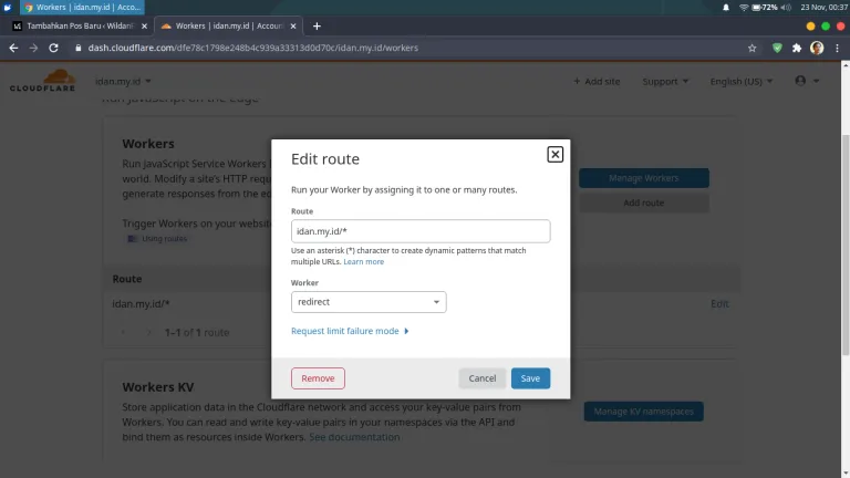 Selanjutnya membuat workers dengan kode diatas tadi jika sudah kembali ke menu workers dan tambahkan add route, tidak lupa tambahkan parameter /* diakhir domain seperti ini.